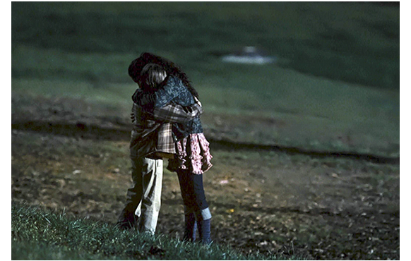 サッカーの慰労会の後、「ジョニだよ。最高にカッコいい女の子」と紹介した後、連れ立って外に出ていく2人。この2人は、シーンは相前後するが、下の1枚目の写真にあるような造形アートを、森の中で一緒に製作した仲だ。暗い木立の下で、「これまで一緒で最高だったね」とティモシー。「私も」。「手の打ちようがないから両親には話してないんだけど、君には知っておいて欲しいんだ」。「何なの?」。「これは、仕方のないことなんだ。でも、心配しなくても大丈夫」。そして秘密を打ち明ける。両親の見たのは、ジョニが「ティモシー」と叫び、2人で抱き合う姿だった。まるで、別れたように見える。後から、そう訊かれると、ティモシーは「うん、さよならしたの」と答える。そして、なぜとの質問に、「分からないだろうね」と曖昧な返事。