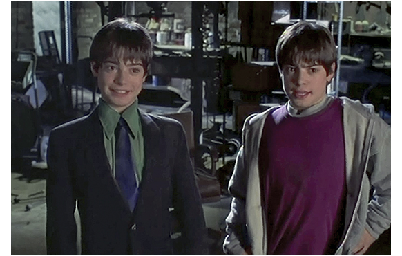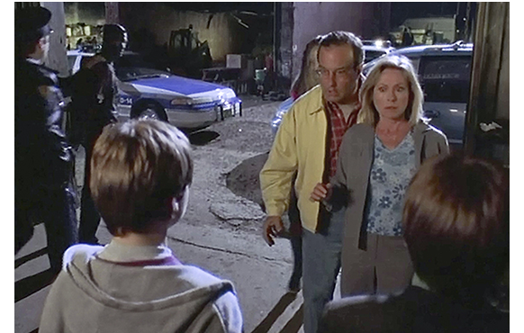 そこに、トゥーイが呼んでおいたパトカーとウイルの家族が駆けつける。Ocean Pups社の2人は少年誘拐で逮捕される。一方、家族の方は、ウイルが2人いることに絶句(1枚目の写真)。ウイルは、理科の実習で、もう一人を作ったと打ち明け、今は庇ってくれと頼む。警官が、「常軌を逸した質問だと思いますが」と両親に前置きして、「君達は…」と訊き始めると、ウイルはすかさず、「…いとこです。そっくりのいとこ。僕はウイル、こっちは…」。トゥーイが引き取って「ギル。ベルギー人」。Ocean Pups社の男が、「クローンだよ。同一遺伝子の被験者だ!」「全部の細胞が同じだ!」と叫んでも、「お巡りさん、あの人たち、まともじゃないんです」「クローン? いとこですよ」(2枚目の写真)〔右がウイル〕。姉も、「二人は見分けがつかないの(Never could tell them apart)」と助け舟。