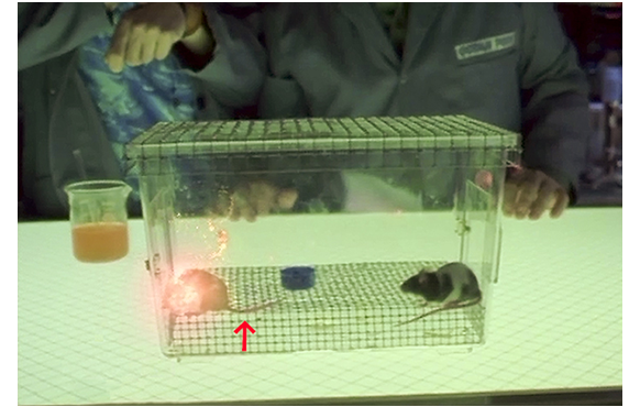 ウイルが絶望して寝室でヨーヨーをやっていると、床に落ちていた雑誌の広告が目に留まる。「自分だけの喜びを育てよう」「科学をやって、楽しもう!」の標語に、にっこりするウイル。郵送料込みで10.7ドルは格安だ。さっそくOcean Pups(海の子犬)社に申し込む。一方、Ocean Pups社の研究室では、怪しげな2人の科学者が、1匹のネズミに薬品をかけ、クローンを作る実験に成功し(1枚目の写真)、喜んでいる。祝杯をあげて実験室を出て行くが、その後で、逃げ出したネズミを追ったネコが、フラスコを転倒させ、クローン化する薬品ができ、それが床に落ち、その下の製品ラインのあった箱の1つに落ちてしまう。その箱がウイルに届けられる訳だが、箱の上に落ちただけなのに、どうやって中に浸透したかは不明。箱の中に入っていたのは、プラスチックの水槽と、海の子犬の粉末の入った小袋と取扱説明書。水温を68-75度(華氏)に設定し(2枚目の写真)、小袋を破って中の粉末を入れる。かき混ぜるものがないので櫛で混ぜるが、その時、櫛に付いていたウイルの髪の毛が反応して光る。説明書の記載内容と違い、すぐに反応が始まり、水槽からブクブクと泡が立ち、光とともに水が溢れ出し、遂には光の柱のようになって飛び出る(3枚目の写真)。怖くなったウイルは慌ててドアを閉め、Ocean Pups社に電話をかける。