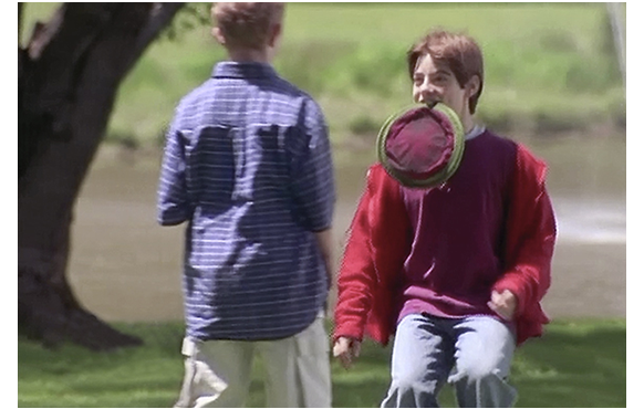 翌日、ウイルたち一家は、施設に預けている祖父に会いに行く。それを聞かされて「家族っていいね」と言うトゥーイ。車を窓から見送ったトゥーイは、家族で楽しく日曜洗車をしている光景を見て何となく寂しくなり、「TVを見てろ」と言われたことなど忘れて、外へ出て行ってしまう。初めて外の空気に触れ、冒険に出かける気分で歩き出すトゥーイ。一方、施設では、祖父はTVの前に座り、自分だけの世界に閉じこもっている。息子とその妻が何を話しかけても返事をしない祖父。ウイルも「やあ、おじいちゃん」と作り笑いをするが、反応は一切なし(1枚目の写真)。ウイルが部屋に戻ると、トゥーイがどこにもいない。その頃、トゥーイは公園に行き、犬にフリスビーを投げて遊んでいる子供を見て、自分もやってみたくなり、「ねえ、僕にもやらせて」と頼む。やったのは、フリスビーを投げることではなく、走って行ってフリスビーを咥えて持ってくる犬の役だった(2枚目の写真)。怖がって逃げる子供。ウイルは、「波長」から、トゥーイが公園にいると感じ、自転車で公園に急行する。そして、トゥーイを呼びつけて、勝手に家を出たことを叱る。「僕には家族はないの?」と訊くトゥーイに、「ない。僕にはあるが、お前は唯のクローンだ」。