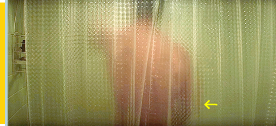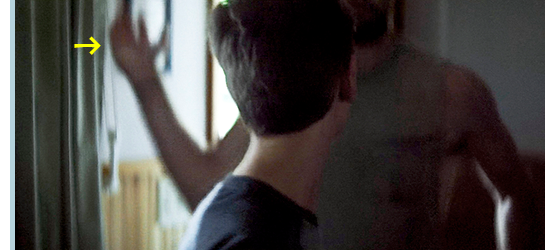 (6)サムは ニックの家に勝手に入り、居間でニックを待つ(1枚目の写真)。シャワーの音が聞こえる。テーブルの上には、写真が数枚置いてある。(7)サムは立ち上がると、シャワー室に近寄る(2枚目の写真)。(8)半透明のビニールカーテンごしに見えたのは、背を向けたニックが右手で自慰行為をする姿(3枚目の写真、矢印)。ここで、サムの目が覚める。サムは、運転席で寝ているニックの鼻頭に触ってみる〔(7)と、最後の行為は、サムがホモセクシャルである可能性を示唆している/自慰行為をしているのでニックはゲイでないという説もあるが、それは疑問〕。