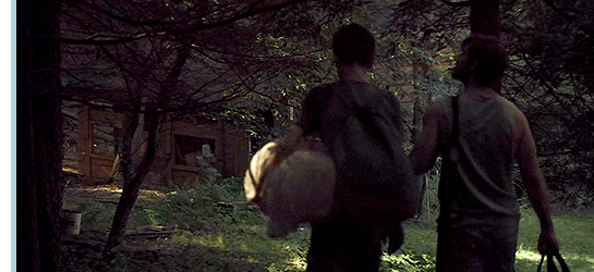 ニックは、山小屋の近くの車止めで駐車する(1枚目の写真)。ニックは、右手に大きなバッグ、左手で猟銃を持つ。サムは、肩にリュックを背負い、左手で大きな荷物を抱えている。この状態で、途中、3人組に遭う。オフシーズンなのに、「射撃訓練をしようと思って」と答え、夕方に近いのに、たくさんの荷物を持っていながら「すぐに引き返す」と言うニックに、3人は不信感を抱く(2枚目の写真)。中年女性に名前を訊かれたサムは、「ジェレマイア」と答える。「半ズボンだから、ツタウルシには気をつけるのよ」と注意されても、心ここにあらずの状態。その時の隠れるような目線も、不信感を煽る〔伏線〕。2人は、まだ夕陽の輝いているうちに山小屋まで辿り着くことができた(3枚目の写真)。