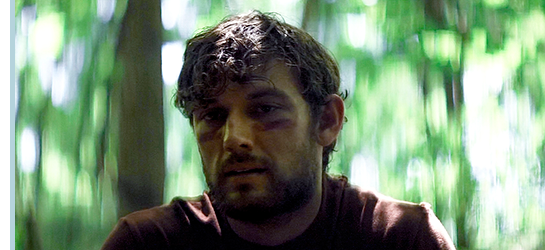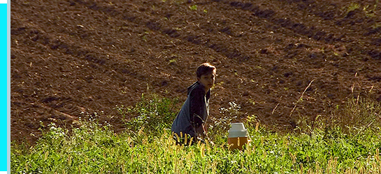映像は、その日の午後に移行する。畑でクワを使って疲れたサムは、水を飲もうとして、畑の上の野原に置いてあるポットに向かう。本編ではそこで場面が切り替わるが、ここではサムは、野原に上がってポットの水を飲む。そして、紙コップを捨て、何気なく振り返って森の方を見る(1枚目の写真)。立ち上がってしばらく見ていると、黒猫がサムを見て森の中に入って行く。サムは、「お前、ここで何してるんだ?」とつぶやくと〔猫に対して〕、森に向かって野原を横切って行く。そして、森との境界。サムは臆せず、そのまま中に入って行く(2枚目の写真)。最後のシーンは、数日前、ニックに連れられて行った洞窟の前(3枚目の写真)。ニックの「別人になったみたいな感じかな」という言葉、ゲアリーの「自分の心をコントロールしろ。やめようと望めば、やめられる」の2つの言葉に支えられ、「父殺し」の過去を忘れて生まれ変わろうと、サムは洞内に入って行く〔警察に保護され、サラに生き恥をさらし、車にはねられて死ぬよりは、キャンプ場にいたときに告白し、自らを律していれば良かった、と言いたいのだろうか?〕。