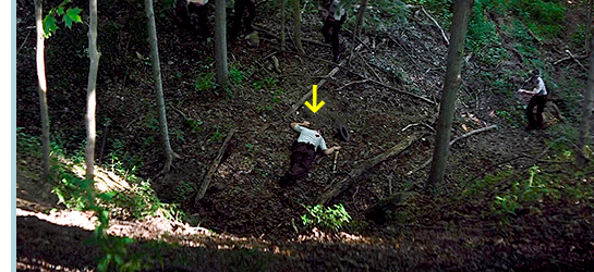 サムが池に入って涼んでいると、遠くの岸に誰かが立ってこちらを見ている(1枚目の写真、矢印)。サムが何かを見つめているので、ニックは「どうした?」と声をかける〔ニックの位置から岸は見えない〕。サムは、「別に」と答え、見たことを黙っている〔これは、追われる身の2人にとって無用心な態度〕。その後、森の中を歩いていると、遠くで枝が折れるような音がする。「あれ何?」。「たぶん熊だろう」。ニックは、熊が寄ってこないようにと、空に向けて威嚇射撃をする。2発目を撃った時に、新たな銃声がして、ニックの左腕が撃たれる。ニックは、サムに「逃げろ」と命じる。その時、また銃声がして、今度は近くの木の幹に当たる(2枚目の写真、赤の矢印は血の付いた指、黄色の矢印は幹に当たった銃弾)。サムは必死になって走る。ニックは姿勢を低くし、無事な方の手で猟銃を抱えて洞窟に行き、暗がりに逃げ込む。最初に洞窟に近づいた警官は胸を撃ち抜かれるが、その後、4人の警官が洞窟を囲む(3枚目の写真、矢印は最初に撃たれた警官、矢印の上に3人の警官がかすかに見える)。そして、森の中に、4発の銃声が響き渡る。