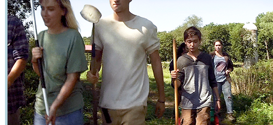 翌朝、サムがゲアリーと会ったのかは分からない。場面は、いきなり、同室の2人が作業に出かける準備をしているところから始まる。ジェレマイアが、「今日は草刈りの日。ローテーションなんだ。庭作業したことあるか?」と訊く(1枚目の写真)。「ううん」。ルークは、「お前、何かしたことあるんか?」と嫌味を言う。ジェレマイア:「教えてやる。できるさ」。16人のグループで畑に向かう。サムも行かざるをえない(2枚目の写真)。全員が広大な畑に分散してクワをふるっている。疲れたサムは、水を飲もうとして、畑の上の野原に置いてあるポットに向かう(3枚目の写真)〔この時は気付かないが、きわめて重要なシーン〕。