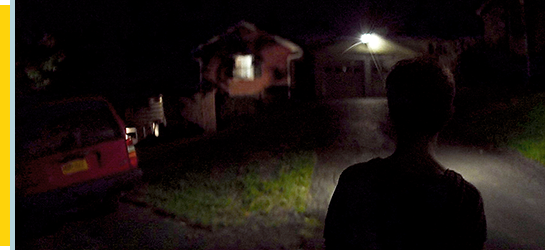 映画の冒頭、夜の闇の中を1台の車が走る。場面はすぐに切り替わり、一連のフラッシュバックが始まる。映されるのは、①サムが部屋のドアを開けて廊下から居間に入って行き(1枚目の写真)、②居間に入ったサムがソファを見、③見下ろすサムの顔のクローズアップ(2枚目の写真)、④床に倒れた男(父)の大きく見開いた目(3枚目の写真)、そして、⑤サムが炎に包まれた家の前に立ち(4枚目の写真)、⑥背後から「サム」と声がかけられ、車のヘッドランプの前でサムが猫を抱きしめる、という5つのシーン。過去のフラッシュバック映像は、左側に山吹色の帯をつけて区別する(タイムラインに沿った映像は白の帯)。そして、再び現在。走る車の中。空は明るくなりかけている。ただし、森の中を抜ける道なので、ほとんど木しか見えない。後部座席に横になったサムの視点から見た映像だ。そして、オープニング・クレジットが始まる。