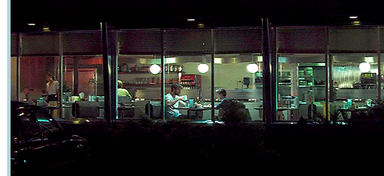 夜中に起きたニックは、車を動かしてドライブインに入る。客はほとんどいない(1枚目の写真)。ニックが、「他に何か食べるか?」と訊くが返事はない。「楽しんでるか?」。「うん」。「そんな風に見えないけどな」。「ちょっと変な感じ」。「変って?」。「たとえて言うと、眠ろうとするんだけど、考えるのをやめられない。眠ってると思うと、まだ目が覚めてるって分かる。ホントなのか夢なのか、他の何かなのかも分からなくなる、って感じ」。「何を考えてる?」。「知ってるよね」。「俺の意見を知りたいか? 考えたり、夢みたりするのをやめたれりゃ、ただ止めろ」(2枚目の写真)「頭の中のものは、望んだ時にだけホントになる。だから、ホントじゃないと決めちゃえばいい」。「何がホントじゃないの?」(3枚目の写真)。「全部だ。この旅を始める前に起きたことすべてだ」〔この会話は非常に奥が深い〕。支払いをする時、店に警官が入って来たので、ニックはサムにお金を渡し、支払いに行かせる〔ニックは 警官を避けている〕。