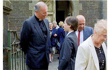 タリアシンは、すぐにエヴァンス老人の家に報告に行くが、不在で会えない。そして、日曜日、タリアシンは司祭に話そうと、朝から正装をしてミサに行く準備をしている。キッチンに下りて行くと、父と兄が食べ終わって新聞に読みふけっている。夢見心地のタリアシンには、その記事が、「世界的特ダネ: イボの奇跡」(1枚目の写真)と、「ウェールズの村の奇跡/地元少年とのインタビュー」という内容に見えてしまう。タリアシンに気付いた兄が、「まだ 奇跡ごっこか?」と冷やかす。父が、「構うな、ジョン」と諌める。「きれいにしたな。じゃあ、行く気なんだな?」。「うん」(2枚目の写真)。「時間は大丈夫か? 遅刻じゃないのか?」。「10時からだよ」〔この一家は、日曜礼拝に行く習慣がないことが分かる〕。父は、タリアシンを車で教会まで送ってくれる。別れ際にタリアシンは、父に、礼拝に出る目的を話す。「神にありがとうって言わないと。イボを取ってくれたら、みんなに話すって約束したんだ。教会は、それをするのに最適だよね」。礼拝が始まり、『ヨハネによる福音書』の第11章が読み上げられる。そのメインは、ラザロの復活。43節の「イエスは大声で叫ばれた、『ラザロ、出て来なさい』」。死んで4日経ち、腐臭が漂い始めたラザロを、イエスが生き返らせる場面だ。その目的は、「周りにいる群衆のためです。あなたがわたしをお遣わしになったことを、彼らに信じさせるためです」(42・43節)〔わざわざ紹介するのは、後で関係するため〕。礼拝後、司祭が出口に立って信者を見送る。司祭は、タリアシンに、「見たことのない顔だね。ここは初めてかね?」。「はい、そう思います。洗礼は受けましたが」(3枚目の写真)。「ぜひお話したいことが。ビリー・エヴァンスはご存知ですか?」。しかし、タリアシンの目論見とは違い、司祭は、エヴァンス老人がほとんど礼拝に顔を見せないと告げただけで、すぐに別の信者への挨拶に移ってしまう。タリアシンの礼拝は、全くの無駄足に終わってしまった。