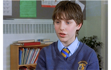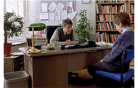 翌日、タリアシンは校長室に呼び出される(1枚目の写真)。理由は、ウィリアム・ジョーンズの母親からの抗議文。内容は、息子が同好会に連れ込まれ、無理矢理 儀式をさせられた上、インシュリンの注射をやめるよう説得された。これは命にも係わることなので、かくも悪質な会は即刻解散させろ、というもの。実情と かけ離れている。校長は、「君は、インシュリンを止めるよう説得したのかね?」と尋ねる。「いいえ」。「じゃあ、何をしたんだ?」。「病人を癒そうとしたんです」。「どうやって?」。「手を当てて祈るんです」。「効いたのか?」。「一度しかやってません。ウィリアム・ジョーンズの問題は、祈り方が不十分だったからだと思いますが、インシュリンを止めろなどとは言ってません」。校長は、ウィリアムが誤解したのだろうと結論する。ただ、タリアシンの動機がつかめたわけではない。そこで、「なんで こんなことを始めたんだ?」と尋ねる(2枚目の写真)。「突如として他人のために祈るなんて、神の啓示でもあったのかな?」。「確かなことは分かりません」。「なぜ、効くと思ったんだ?」。「見たんです。実際に見てない人に説明するのは難しいのですが… 一度話したんですが、信じてもらえませんでした。そこで、僕が自分で癒してみせれば、みんなにも分かると思ったんです」(3枚目の写真)。それを聞いた校長は、こう結論する。「君がしたことが間違っているとは思わない。しかし、ジョーンズ夫人の怒りを鎮めなければならん。一種の妥協だな。だから、君は、来週の月曜に全校集会で発表するんだ」。かくも理解のある校長だが、タリアシンがクラスに戻ろうと立ち上がった時、チクリと一言。「これ以上、空想的なことはするなよ。『若き救世主に何かされました』なんて抗議文は、もう見たくないからな」。