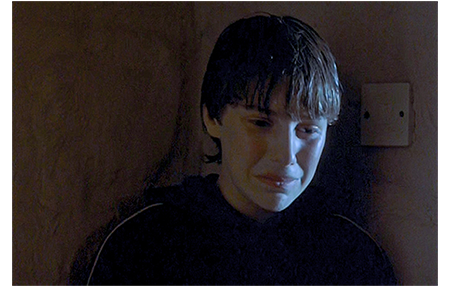 お昼の休憩時間に、3人はウィリアムに、「『信じる者たち』って同好会作ったんだけど、入らないか?」ともちかけ、OKをもらう。4人は、大きな木の下に行き、真ん中にウィリアムを立たせ、3人で周りを囲む。正面に立ったタリアシンが、「ウィル、目を閉じて」と言い、3人がウィリアムの頭に手を乗せる(1枚目の写真)。タリアシンはウィリアムのミドル・ネームを訊き、祈りを唱える。「神の名において、ウィリアム・ジェラードに癒しが与えられますように。アーメン」〔エヴァンス老人のやり方とは全く違っている〕。リュークが、「良くなった感じする?」と訊く。「効いたみたい」。リューク:「じゃあ、もう注射なんか打たなくていいんだ」。この楽天的な言葉に、タリアシンは、「だけど、治るまで くり返さないと。糖尿病が治るまでに、何回必要なのか知らないんだ。注射をやめる前に、もう一度やるべきだ」と釘を刺す(2枚目の写真)。遠くから4人の行動を見ていたフーパーは、寄ってくると、タリアシンが後生大事に抱えていた聖書を取り上げる。そして、子供向きだとバカにし、表紙を補助金具で傷つけ始める。怒ったタリアシンは、フーパーの目を見て「くそったれ」と言い、顔を殴られる。フーパーは、「『甘んじて侮辱を受けよ〔Turn the other cheek〕』だろ、虫野郎。聖書が言ってるぞ」と捨て台詞を吐いて去って行く。鼻血を出したタリアシンに、リュークは、「殺されるとこだったな。鼻の骨に当たって脳みそまでやられてたかも」と慰める〔彼が一番の問題児→ウィリアムに注射を即止めるように言ったのも彼→後で、大問題になる〕。まともなことをしたのは、もう1人の友達。ハンカチを渡してくれる。ウィリアムも、上を向いてとアドバイス(3枚目の写真)。
