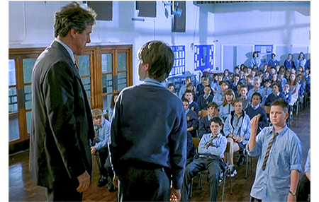 授業時間になり、校長が入ってくる。担任の体調が悪いので、急きょ交代したのだ。校長は、「今日の授業は『宗教』なので、その話をしよう」と言うと、教壇にもたれかかり、「なぜ『宗教』を学ぶのか、言える者は?」と問いかける(1枚目の写真、赤の矢印はタリアシン、黄色の矢印は宿敵フーパー)。タリアシンは、「神を知るためですか?」と答える。「そうだ。宗教を学べば、我々が『いかに、なぜ』神を信じるかが理解できる」。すぐに反論があがる。クラスの問題児フーパーだ。「それって、神を信じてなきゃ、宗教の勉強はパスしていいってこと?」。「多くの人が宗教を研究している。神を信じてなくてもだ」。「神なんか誰も信じちゃいない」。「それはどうかな。君達の中にも信じている子はいるだろ」。「親に強制されてるだけさ」。「君は、なぜ信じないんだ、フーパー?」。「目に見えないものは信じない」。「タリアシンは?」(2枚目の写真)。「僕は信じます」。フーパーは「答えになってない」と批判。ジュリーが「信仰には、理由なんかいらない」と援護すると、フーパーは「くだらない」と言って、タリアシンの頭にボールをぶつける。校長は、「君を罰するのにはもう うんざりした」と言い、「クーパーを、どうしたらいい? 君らが決めろ」と生徒たちに投げかける。普通なら、復讐を恐れて黙っているのだろうが、タリアシンは、「全校集会で… トラクターの事故でどうやって指をなくしたかを話すとか…」、と提案する(3枚目の写真、矢印はフーパー)。フーパーは、「殺してやる、虫野郎。こいつを鼻にぶち込むぞ」と金具を振りかざす〔潰された手のための補助金具〕。校長はただちに黙らせ、全校集会での発表を命じる。「反論は許さん」。
