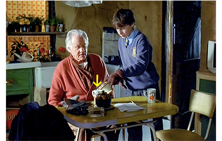 イボ・ショックで、タリアシンは、レッスン日でないにも係わらず、エヴァンス老人に会いに行く。自分のための相談なので、エヴァンス老人のためにミルク・ティーを作る(1枚目の写真、矢印はミルク)。エヴァンス老人は、冗談で、「どうだい、魔法使いの見習いの調子は?」と訊く。「大問題でも起こったかな?」。「疲れちゃって」。「疲れた? まさか。一体どうした?」。タリアシンはイボだらけの手〔HPV感染で起こるウイルス性のイボ〕を見せて、「これ、なくしてもらえないかと思って」と本音を語る(2枚目の写真)。「なくしたいのかね? 痛いのか?」。「あんまり。学校のみんなが、悪口言うけど〔calls me names〕」。「子供は 時に残酷だからな」。「これ、とれる?」(3枚目の写真)。「イボはイボだ。神は 山を動かすようにイボも取って下さる。とにかく、ピアノの鍵盤に触れる前に治しておかんとな。ちゃんと弾けるように」。そう言うと、エヴァンス老人は、タリアシンの手を触りながら無言で祈る。