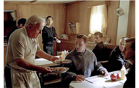次のシーンでは、もうバートのオンボロ車がインディアンを牽いて戻ってくる。助手席には、フランが座っている。迎えたのは、クラブの3人。トムの父ジョージが芝刈りをしてくれている(1枚目の写真)。この時点では、電話があってから少なくとも3週間は経っているので、地元のニュースにもなって久しい。車から降りたバートを出迎えるジョージの顔は、いつもと違い、すごく嬉しそうだ。「私たちも鼻が高い。インヴァーカーギルが有名になった」と声をかける。そして、最後にバートが会ったのがトム。しっかりと握手する(2枚目の写真)。「言われたように、レモンの木を世話したよ」「鶏にエサも。ママが全部料理した」。そして、小屋の鍵を返す。「どのくらい出たの?」。「1回は、時速200マイルを超えた」。「そのスピードで口を開けるとどうなるの?」。「尻からパンツが吹っ飛ぶだろうな」。その返事にトムが笑う(3枚目の写真)。「ウチはいいな。わが家に戻った」。
