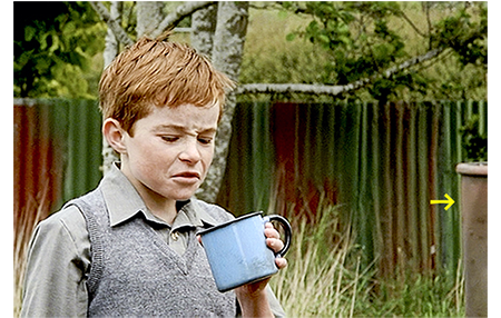 バートは、シャープナーでナイフを研ぐと、タイヤを両足で挟み、表面のトレッドパターンを削り落とし始める。「できるだけ多くのゴムを削り取らんとな」と言い、インディアンのシートの後ろに載っている燃料タンクの丸い筒の部分を叩いて、「こんな風に、ほとんどつるつるにする」と具体的に示す。「どうして?」。「高速になると、遠心力がタイヤを膨張させ、車体をこすっちまう」(1枚目の写真、矢印はナイフ、右手のすぐ左に見える丸いものが燃料タンク)。タイヤを削ってトレッドをなくしてしまうのはとても危険で、後で、レースに参加しようとしてストップを食らう原因の一つになるくらいだが、バートは理論ではなく長年の経験に従って行動している。その後、トムは、意外なことを質問する。「なぜ、レモンの木におしっこするの?」(2枚目の写真)。「誰から聞いた?」。「ママが言ってる。毎朝おしっこしてるって、くどくど言うんだ〔she goes on and on about it〕」。「木のためさ。どんなものも、無駄にしちゃいかんからな」。トムは、「もう家に戻らないと。ここに長くいすぎると、ママが不機嫌になるから〔Mum gets a bit cross〕」と言い出す。ナイフはまだ使っているので、バートが自分で返しに行くと言うと、トムはこっそり持ち出した手前、後で取りに来ることにして立ち去る。しかし、トムが学校に行った後、ナイフがなくなって困った母は、当たりをつけてナイフがないか訊きに来る。バートが返したことで、トムの「犯行」がバレてしまった。