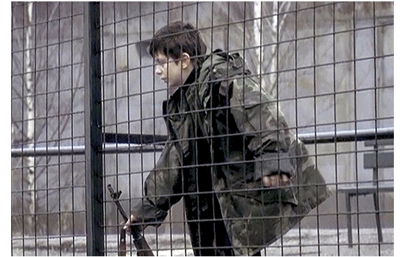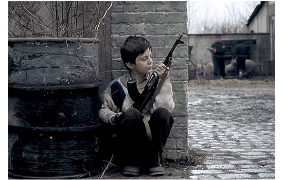 ルドヴィッチがゾイクをベッドに座らせる。母は、「どうしたの?」とゾイクに訊くが、その一方で、ルドヴィッチは、彼女が、隠しておいた自分の日記(一種の詩集)を読んでいたことに気付く。「これは、私的なものだ。ここは私のウチなのに、秘密も持てないのか!」。それに対し、「美しい言葉だわ」と讃えるアンキィッツァ。だが、ルドヴィッチは、「よくも言えるな! 君に盗み見る権利はない! 出て行って欲しい。聞こえたか? 今すぐ出て行くんだ!!」と激高する。その声に反応して、カラシニコフをつかんで部屋を飛び出して行くゾイク(1枚目の写真)。それを見た母は、「何をしたの?」。「私がか?」。「そうよ!」。ルドヴィッチもアンキィッツァには弱い。結局2人で園内を「ゾイク!」と捜し廻ることに。そこに、中尉の部隊一のスナイパーが歩いて園内に入って来る。「ルドヴィッチ、どこにいる?!」と呼ぶ隊員。ルドヴィッチはアンキィッツァを門番の詰め所に隠し、隊員の前に現れる。「何度、呼ばせるんだ? 中尉からのいい知らせだ。あんたにとって幸運の日だな」。そこまで言ったところで、銃声が1発響き、ルドヴィッチの顔一面に血しぶきがかかる。そして、もう1発。崩れるように倒れる隊員。ゾイクが撃ったのだ。ゾイクは、死んだ隊員の所まで歩いてくると、復讐を込めて3発連射する(2枚目の写真)。子供が銃で大人を射殺するシーンなど、映画でも、滅多に見られない〔『キック・アス』のジョークのような殺人は別にして〕。「狂ったのか? 何をする? 自分のしたことを見てみろ!」。止めに入る母。「もう十分しょ。あなたの父親じゃない。大げさに言わないで」。一番の部下を殺したことがバレるのを危惧するルドヴィッチと、夫を殺された恨みをぶつけるアンキィッツァ。その間に、ゾイクは、ルドヴィッチに奪われたカラシニコフを奪い返して逃げて行った(3枚目の写真)。
