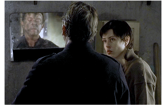 ここで、大きな変化が訪れる。いつも座っている机からふと窓の外を見ると、少年と、もう一人の大人がこちらに向かって来る(1枚目の写真)。せっかく追い出したのに、2人に増えて戻って来るとは! 少年は勝手にドアを開けて入ると、同僚を手招きする。ルドヴィッチ:「いったい何の真似だ?」。そんな問いかけには構わず、少年は中に入ると、棚から薬を取り始める。「命を助けてやったのに、これがその礼か?」。銃を構え、撃鉄を起こす少年。いつでも撃つことができる。「私を殺すのか?」。ルドヴィッチは、戸口に立ったまま無言の大人に、「何か言うことはないのか?」と訊く。「名前は?」。代りに少年が、「食料と薬を寄こせ」と言う(2枚目の写真)。その時、女性の声がして、「名前は危険よ。殺されるわ。シャワーはないの? 何日も洗ってない」。「動物園は閉園中だ!」。無言。「銃を降ろせ」。そして、ドアを閉める。これは、脅迫下において、滞在を許したことを意味する。さっそく、胸に何重にも巻いた布を外し始める女性(3枚目の写真)。髪もショートカットなので、声を聞かない限り男性と間違える。女性は、「男たちは撃ち殺され、女たちはレイプされた」と言う。それが男装した理由だった。