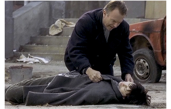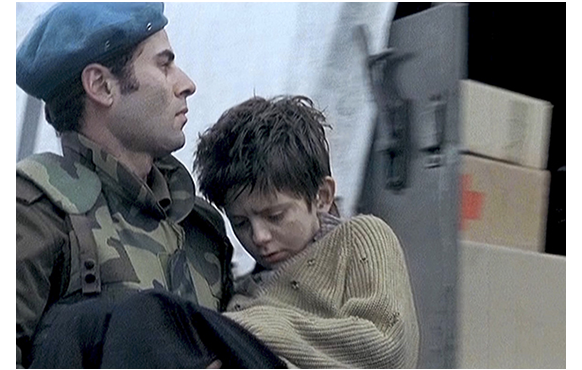 少年が、母の寝ているルドヴィッチの部屋に戻って来る。「ゾイク、どこにいたの?」。ここで、映画の画面上では、ルドヴィッチは初めて少年がゾイクという名前であることを知る。「出血してるの?」。ルドヴィッチが歩み寄り、手を取って「手が血だらけだ」(1枚目の写真)と詰問する。「僕の血じゃない」。そして、ゾイクは、ポケットからカートン入りのタバコを取り出し、ルドヴィッチの胸に突きつけるように渡す。「これは何だ?」。「あんたのために取ってきた」(2枚目の写真)。「タバコのために誰かを殺したのか?」。「もう死んでた」。「この拳銃は?」。「見つけた」。母が、「何がどうなってるの?」とゾイクに訊く。「別に」。この子、誰に対しても無口だ。それだけ心の傷が大きいということだろう。それでも、もらったタバコを吸おうとするルドヴィッチに、ライターで火を付けてやろうとする。慣れていないので、火が付かない。「カラシニコフは使えても、ライターはダメなのか?」「これも、見つけたんだな?」。ルドヴィッチが別室で作業をしていると、アンキィッツァが「説明させてもらえる」と話しかけてくる。「ゾイクが、あなたは友達だと言って、ここに連れて来たの」。さらに、別れた経緯についても、「兵士が来た時、ゾイクは男達と連れて行かれた。あの子の父を見たのは、それが最後。女達は、兵舎に連れて行かれた。そのうちの一人は、昔、奥さんが病気の時 看病をしてあげた。でも、そいつは兵士達の中で最悪だった。ナイフを突きつけてレイプするの。首の後ろにね。そして涙を流すアンキィッツァ。「どうやって、ゾイクを見つけたんだね?」。「安全な所まで逃げた時、そこにいた村人から、街に行ったと聞いたから捜しにきたの。自活できるようになってるなんて思わなかった。もう大人みたい。あの子らしくないわ。でも、優しくしてやって、お願い。あなたに気に入られたいだけだと思うの」。