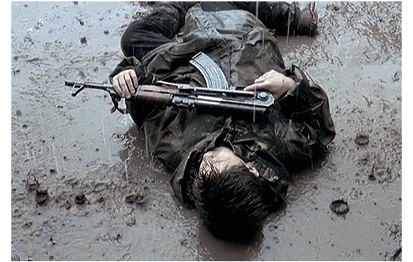 ある雨の日、ルドヴィッチが点検のためドアを開けて外に出ようとすると、そこにカラシニコフを構えた少年がいた(1枚目の写真)。「ここは私有地だ。出て行け!」。そう命令しても、足を引きずりながら、戸口に近づいてくる(2枚目の写真)。「何が望みだ?」。少年は、何も言わず、その場で気を失う(3枚目の写真)。先日、忍び込んだ時はまだ元気だったので、地雷の爆発で負った足のケガが化膿して敗血症になりかけてしまったのかも。