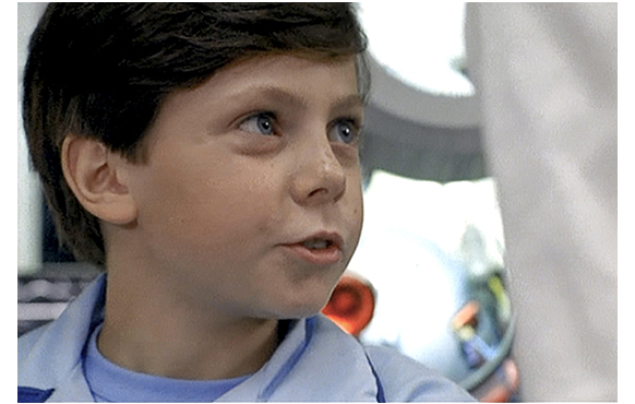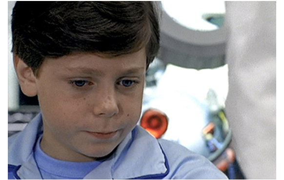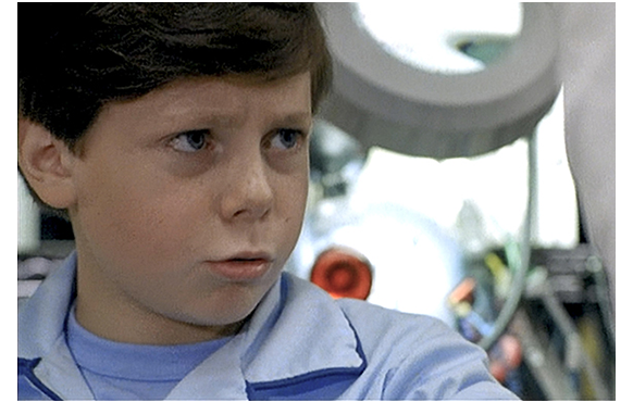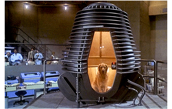 最初は、見つけて喜び(1枚目の写真)、犬に手を振っているが(2枚目の写真)、実験が始まり、犬が分解され消えると、何事かとびっくりする(3枚目の写真)。実験担当者が、もう一方のポッドを見に行く。どうなったかと、固唾を呑むマーティン(4枚目の写真)。「成功だ。中で動いてる。まだ 生きてるぞ」の声に喜ぶが(5枚目の写真)、すぐにDNAが破壊されバケモノと化した犬が襲いかかり、悲鳴を上げる(6枚目の写真)。大好きだった犬の惨めな最期は、マーティンにとって大きな衝撃だった。隠れていたこともバレてしまい、保護者で父親代わりの社長に抱きつく(7枚目の写真)。