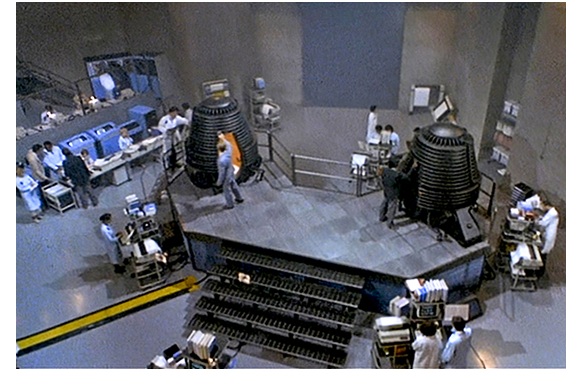 マーティンの机に夕食が運ばれてくる。「今日はついてるな、マーティン。ラム・チョップにフレンチ・フライ。大好物だろ?」(1枚目の写真)。マーティンは、食事をこっそりポリ袋に入れると、一口かじる(2枚目の写真)。そして、犬のところに持って行くが、箱は空にされ、「17番区画に移動」と貼ってあった。犬の行き先を捜すうち、マーティンは大きな実験室を発見する(3枚目の写真)。台の上に載せられた2つの容器が、物質転送機「テレポッド」だ。それとは知らず、ポッドの中に入れられる犬を発見する(4・5枚目の写真)。