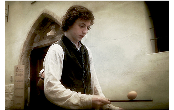 ウールの説明は続く。「少年時代に、彼は旅の魔術師に出会ったとされる」。エドゥアルトが畑の間を通る道を歩いていると、木の下に見知らぬ男が一人座っている。男の存在に気付くエドゥアルト(1枚目の写真)。エドゥアルトが黙って前を通り過ぎようとすると、「おい 君」と声がかかる。エドゥアルトがそばに寄っていくと、男は左手を拡げてエドゥアルトの胸の前で何かを捕まえるフリをし、手を開くと生きたカエルがいた(2枚目の写真)。カエルを握ったまま、手を裏返し、右手で中から棒のようなものを引き出すと、それは1本の赤いバラになる。エドゥアルトの目の前でバラを振ると、それは木の笛に変わる。そして、笛を横にして右手を開くと、笛は宙に浮いて去って行った。それを見て、驚愕のあまり目を見開くエドゥアルト(3枚目の写真)。「その男自体も消えたと、話す者いる」。男が消えていく。「さらに、木も消えたとか」。木もなくなる。「実際に何があったのかは、誰にも分からない」。