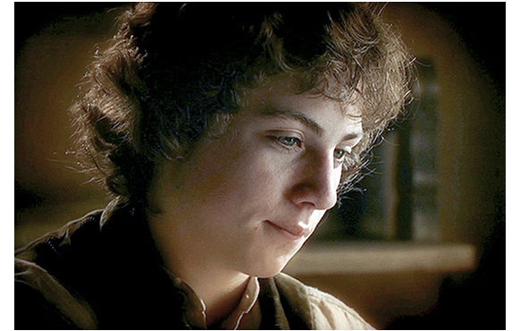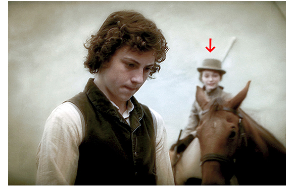 それから、エドゥアルトはマジックを練習し始める。最初は赤い玉を消す手品だ。「周りの人々は、彼に特別な力があるのではと思い始めた。少なくとも、どこか違っていると」。エドゥアルトは、細い木の棒の上に生卵を乗せ、村の通りを歩いている(1枚目の写真)。村人は、誰しも、その不思議な光景を振り返って見ていく。「そして、彼女と出会った」。エドゥアルトが卵を乗せて慎重に歩いていると、仲間の貴族の若様3人と一緒に乗馬姿でテシェン公爵令嬢ゾフィー(英語なのでソフィーと発音している)。若様たちは、小作人のエドゥアルトを「ガラクタ野郎」とか「どぶネズミ」と呼んでからかうが、ゾフィーは好意的に見ている(2枚目の写真、矢印がゾフィー)。