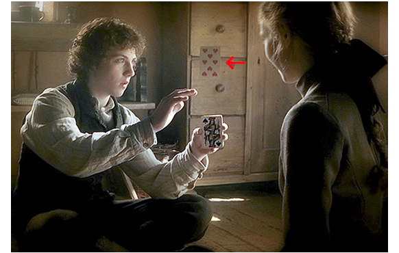 ゾフィーはそのまま、エドゥアルトの後に付いていき、エドゥアルトに手品を見せてもらう。簡単なカードの手品だ。エドゥアルトがカードを扇状に開いて「1枚引いて」と言い、ゾフィーが1枚選んで取ると、「それを、中に戻して」と戻させる(1枚目の写真)。そして、「じゃあ、見てて」と言うと、左手に持った束ねたトランプの中から、先ほどゾフィーが引いたカードだけがせり出してきて、そのまま宙に浮いていった(2枚目の写真、矢印)。その時、ドアがいきなり開き、「テシェン公爵令嬢が、このような場所に入られてはなりません。ここは小作人の家です。ご身分をお考え下さい」と女官が言い、ゾフィーを連れ出す。恐らく先ほどの3人が告げ口したのであろう。馬車で連れ去られるゾフィー。走って後を追うエドゥアルト。エドゥアルトは途中であきらめて立ち止まる(3枚目の写真)。「彼女は城へ連れ戻され、2人は会うことを禁じられた」。