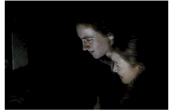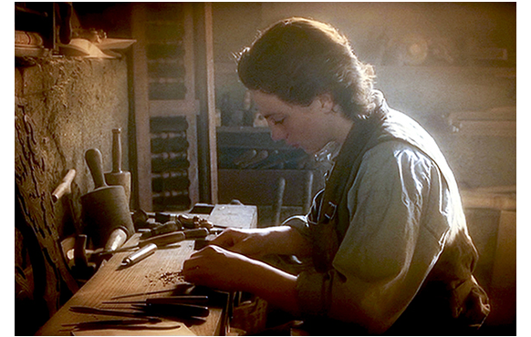 映画の冒頭、40歳のアイゼンハイムの最後の舞台が描かれる。内容如何によっては詐欺から公共秩序妨害、帝国に対する脅威の罪状まで課せられることになる重要な場面だ。交霊マジックが行われる劇場内にはウィーン市の警官が多数動員されている。それを指揮するのはウール主任警部。それを直に命令したのはオーストリア=ハンガリー帝国の皇太子レオポルドだ。ウールはアイゼンハイムに好意的で、無謀なことをするなと事前勧告したにもかかわらず、アイゼンハイムは挑発的な交霊マジックを行う。ウールは罪状を大声で宣告し(映画開始後4分11秒)、アイゼンハイムを逮捕し、皇太子にその報告に行く。その時、「あの者の過去についても、何か把握しているのであろう?」と訊かれ、「はい、そう思います」と答え、過去への回想に入って行く。回想は、皇太子に対する説明ではなく、映画の観客を対象にした独白だ〔レオポルドは非常にせっかちで、平民出の警部の話を長々と聞くような人物ではない〕。だから、日本語版DVDの吹替えverで、皇太子に対して説明するような口調になっているのは全くの間違い〔字幕の方は正しい〕。さて、ウールによる解説は、「確かに、我々は彼の過去をよく知っている。彼を知るほとんどすべての人間に話をきいたから」から始まる。ここで、家具職人の父と一緒に働いている、エドゥアルト(後のアイゼンハイム)が映される(写真)。ただ、このイントロダクションは、後から観返すと非常に不自然だ。というのも、映画の後半1時間27分55秒にウールは、同じ宣言をしてアイゼンハイムを逮捕しようとするが、アイゼンハイムは交霊で出現させた公爵令嬢の亡霊と同様、消えてしまい、それ以来、彼の行方はようとして知れない。だから、「アイゼンハイムを逮捕し、皇太子にその報告を言いに行った」ということはあり得ない。それどころか、ウールはアイゼンハイムの仮の住居に捜査に赴いた時、そこで皇太子による令嬢殺害の証拠を発見。皇太子の部屋を訪れるのは、その報告(皇太子による公爵令嬢殺害、及び、政権転覆計画をフランツ・ヨーゼフ1世に伝えたという報告)をするため。従って、冒頭のこのシーンは、単にアイゼンハイムの過去を紹介するために「捏造」した、「ありえない状況」と言える。