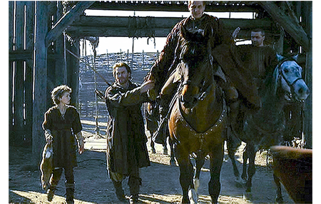 場面は替わり、マルク領主の砦の手前の石橋を馬車が渡っている。中央に右手首を失ったマルク、そのすぐ後ろをトリスタンが歩いている(1枚目の写真)。マルクの砦もアイルランド軍に襲われ、多くの建物が焼け落ちている。女性が1人、マルクに駆け寄ってきて、手首を見て泣いて抱きつく。「夫はどうした?」。泣き続ける女性。「妹よ、気の毒に」。妹は、「処刑は 丸一日続いたわ。奴ら、楽しんでた」。「老人から子供までか?」。「あれ、誰なの?」(2枚目の写真)。「トリスタン、アラゴンの息子だ。我々が彼の面倒を見る」。それを聞いた妹は、トリスタンが父母を失ったと悟り、トリスタンの前まで行くと、「あなたと同じ年頃の子がいるの」と話しかける(3枚目の写真)。そして、「メロー」と、息子を呼び寄せる。将来、トリスタンと宿命のライバルとなる少年だ。一方、マルクは、先の会合の際、「私の妻は子を宿している」と話していたが、妹以外誰も迎えに来ないので、妻と後継ぎの双方を亡くしたことを悟る。