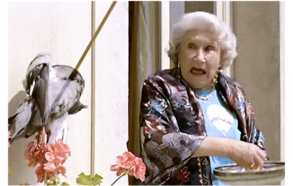 その日の夜。アパルトマンでは、ステファンとシャルロットの間では険悪なムード。「世話はするけど、納得いかないの。2年前、子供が欲しいと言ったら拒んだでしょ。2人だけで暮らしたいとか、重荷になるとか、キャリア第一だとか。これでも、傷付いたのよ。そこへ、前の奥さんの子供を連れてきたのよ。言っちゃ悪いけど、山猿みたいな子。しかも、離婚の手続きも中断したまま」。「戌年に結婚したいと言い出したのは君だ! だから僕は、南米の奥地まで足を運んだ! ところが、帰ったら4500トンの大豆のせいで会社はクビ寸前だ! おまけに、野生のガキまで!」。バルコニーにハンモックを吊り下げて寝ているミミを見て、「どうすりゃいいんだ?」と呟く父。明くる日の朝。隣の棟のアパルトマンのベランダで、老婦人が寄ってきた鳩に、「ポッポちゃん。お腹空いたでしょ、いらっしゃい」と餌をやっている。そこ向かってミミの弓矢が向けられ(1枚目の写真)、放たれた矢は、舞っていた鳩を射抜いて壁に突き刺さる。驚愕する老婦人(2枚目の写真)。騒ぎを聞き、「ミミ、何をした?!」と飛んできた父は、急いで窓を閉め、「ここじゃ、ダメなんだ。鳥なんか食べない。食い物ってのは…」と言うと、朝食用のシリアルの箱と牛乳パックを持ってきてミミの横に置き、「これが朝食だ」(3枚目の写真)。一口食べたミミは、吐き出した。