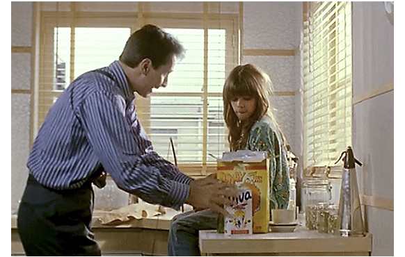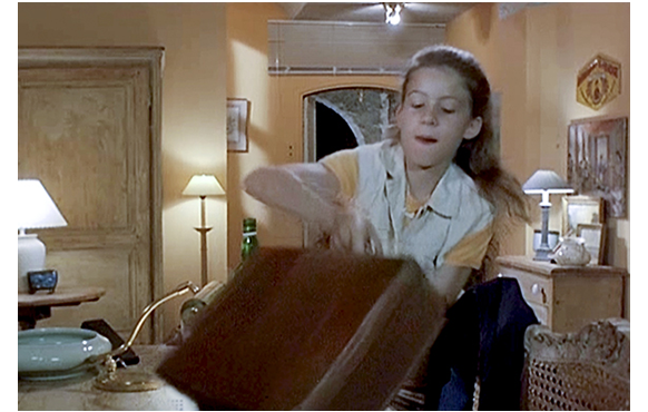 一方、アパルトマンでは、バスに閉じ込められた形のシャルロットが、ドアの下にタオルを詰めて、タランチュラが入って来ないよう必死で防いでいる(1枚目の写真)。そこに到着した2人。ミミは、さっそく壁にいた蜘蛛をつかみ、父から「二度と出すな!」ときつく注意される。ステファン:「あの子のペットなんだ」。シャルロット:「なら、最低のペットね。あちこちでフンをして、きっと、そこら中で卵産んでるわ」。「駆除業者を呼んで、部屋を消毒させるから」。「それじゃダメよ、引っ越さなきゃ!」。そう言うと、「私もう限界」と言って猫を抱いて出て行く。ステファンがシャルロットを宥めようと電話をかけている間、ミミは炒めたポテトを空中に放り投げて口でキャッチしている(2枚目の写真)。電話を終えた父は、「行儀が悪いぞ! フォークを使えと言ったろ」と叱る。ミミは、手でポテトをつかむとフォークに刺し、「どうして出てった?」と訊く。「一番よく分かってるはずだ」。「恋人、一人?」。「恋人は、一人に決まってる」。「まちの中、女の人 たくさんいる。見えない?」。「誰かを愛すると、説明しにくいが、彼女しか目に入らない。他人は、まるっきり見えなくなっちまう」。「ボク 見えるよ」〔伏線〕。父は、「明日は別行動だ。預かってもらう」と言う。預かり先はリシャールの家。