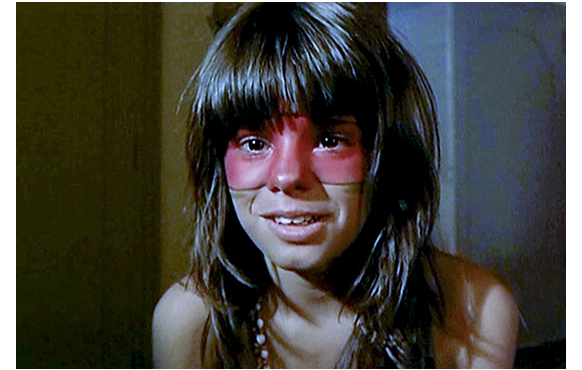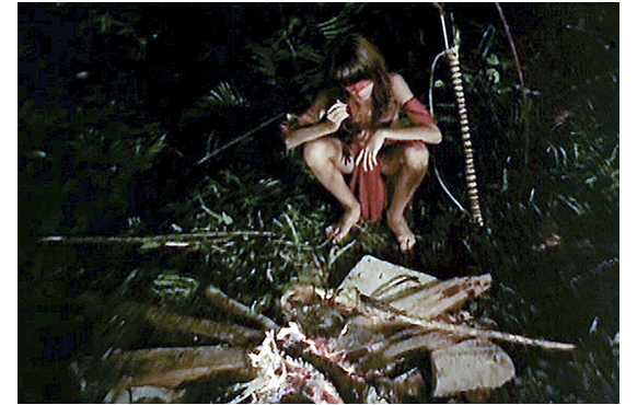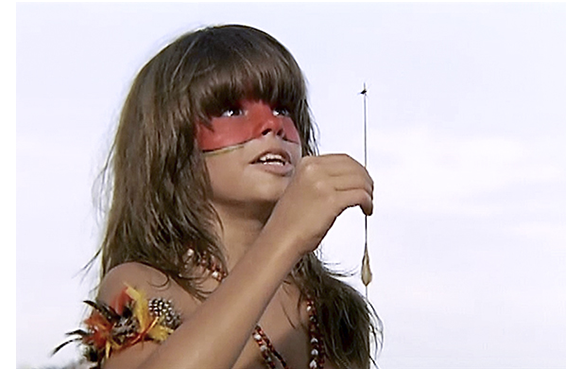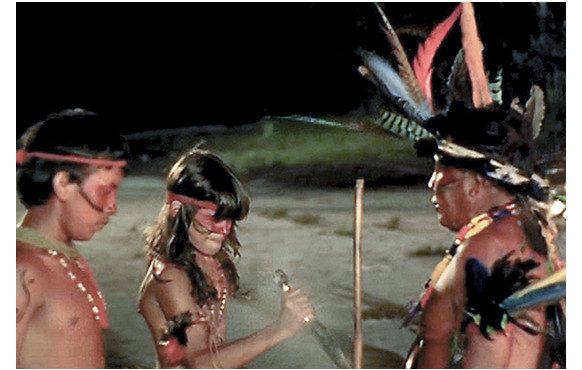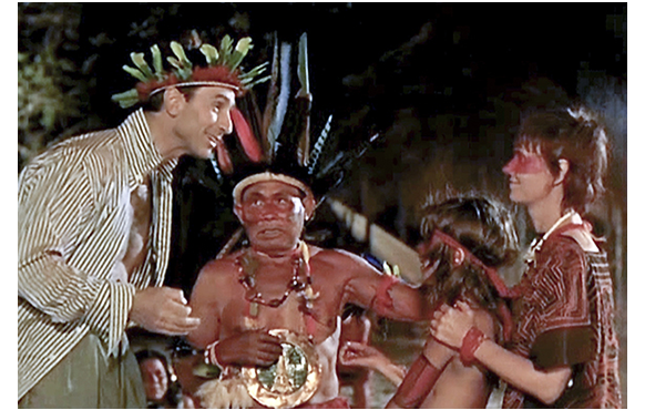 モーターボートはガス欠で動かなくなるが、ミミは、「岸に上がって野宿する。太陽 出たら、出発」と先導する。枝を集めた2人。ソフィーが石を捜して来て、「これで、火 起こせるでしょ?」と言うと、ミミは、「それ よくない。こっちが いい」と言って、以前 秘書からもらったライターを見せる(1枚目の写真)。焚き火ができると、ミミはソフィーの顔にペイントを施し(2枚目の写真)、「君も、インディオ。名前 選んで?」と訊く。「付けてくれる?」。「ウクミ。広い川に降る雨」。「素敵ね」。キスする2人(3枚目の写真)。監督が、「女の子とキスする方が、シャン=ゼリゼを裸で歩くより、よほど難しいらしい」と笑ったシーンだ。一方、追いかけているカヌーの中では、2人が喧嘩。「全部、チビ猿のせいだ」。「全部、お前のせいだろ! 今度 猿と言ったら放り出すぞ。金が何かも知らんのに、盗むと思うか?」。「悪賢いチビ猿だから、早く学ぶさ」。ここで、櫂で一発叩かれる。そうこうするうち、2人は、岸辺のモーターボートを発見する。