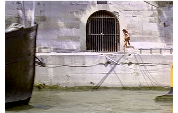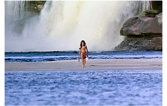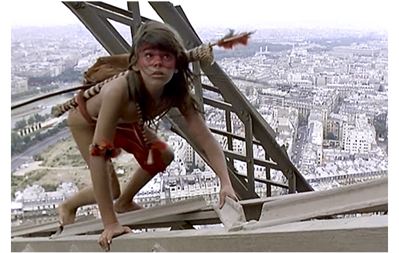 タイトルに続き、最初に現れるのが、滝をバックに中洲を歩く少年の姿(1枚目の写真)。この滝は、少年の住む村リポ・リポの岸から遠く望む正面にある。その次が、少年が崖を楽々と登って行く姿(2枚目の写真)。後で、楽々とエッフェル塔を登って行ける背景説明になっている。その後、ジャングルに入った少年は弓矢でトカゲを射抜く。これはパリで鳩を射抜く伏線。そして川をボートで下り(セーヌ川も下る)、最後はジャングルの中で火を焚いてトカゲを焼いて食べている(パリでは熱帯魚やセーヌ川の川魚を焼く)。