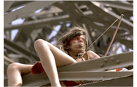 空港に着いたステファンを待っていたのは、リシャールの衝撃的な言葉。「今朝、149ドルにガタ落ちだ〔149ドル×4500トン≒67万ドル。購入額80万ドルから13万ドルの下落→約1350万円の損失〕。最低最悪、もうお終い」。「昨日、売ったんだろ?」。「売ってない?」。「もちろんだ。売りの確認、しなかっただろ?」。そして、リシャールは、「社長は、俺たちで穴埋めしろと」と絶望的な状況にあることを伝える(1枚目の写真)。この写真で注目して欲しいのは、2人の服が、ネクタイに至るまで全く同じという点。制服ではない。これは、能力のないリシャールがステファンの真似をして少しでも近付こうとしているため。これ以後の写真でも、2人が同時に映っている写真は7枚以上あるが、着る服は違っても、2人の服装は常に同じ〔見ているのは面白いが、いざ実行しようとしても、朝、ステファンが何を着るかをリシャールが知るのは不可能だと思うが…〕。リシャールは、ミミを見て、「どこで見つけた?」と訊く。「南米のジャングルで育った パトリシアの子さ」。「でも、シャルロットは どうする?」。ステファンは、2人を連れて、エッフェル塔近くの豪華なアパルトマンに向かう〔ノベライズされた本ではエリゼ・ルクリュ(Elisée Reclus)通りとなっているが、これは明らかな間違い。映画のずっと後で、朝ゆっくり目に起きたミミに、父が、「太陽が塔に着いたら、1時間」と時間の経過を教えるシーンがある。午前10~11時ごろエッフェル塔の方角に太陽が見えるためには、塔の北北東(セーヌ川の対岸)にいる必要がある。エリゼ・ルクリュは塔のすぐ東側なので問題外。2枚目の写真は、ミミがエッフェル塔を見ているシーンだが、ここで注目すべきは、正面に延びるセーヌ川。そこには、一番遠くのコンコルド橋からアレクサンドル3世橋~アンヴァリッド橋~アルマ橋までが一直線に映っている。ということは、この撮影地点は、セーヌ川右岸の屈曲点、恐らくは、セーヌ川に面したMona Bismarck American Centerの1つ西にある建物の屋上からの撮影であろう。エッフェル塔からの直線距離は500メートル弱の場所だ〕。ステファンは、リシャールにミミを任せて、1人でシャルロットに会いに行く。ミミを連れて来たことを事前に知らせるためだ。ステファンが部屋に入って行くと、シャルロットはウェディング・ドレス姿で出迎える(3枚目の写真)。そして、自分が師事している怪しげな東洋の神秘思想の導師から結婚の日を決めてもらったと 嬉々として話す。ステファンは離婚に時間がかかるのでその日程は無理だと言う。そして、息子を連れて来たことも。名前の由来は、「あっちじゃ、自分で選ぶんだよ、好きな名前を。『コーヒーカップ』 とか『庭のイス』とか、何だっていいんだ」と話す。その頃、待っている車の中では、サンバイザーに止まった蝿を、ミミが小さな吹き矢で仕留める。近くを飛んできた細い棒に驚くリシャール。ミミは矢を引き抜いて蝿を見せ、「マイティカにやる」と言う(4枚目の写真)。リシャールは、それがタランチュラだとは思いもせず、「そうか、きっと喜ぶぞ」と褒める。