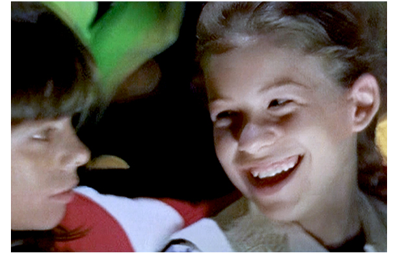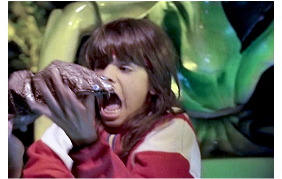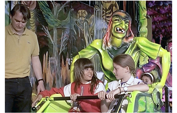 パリ市内の遊園地(Foire du Trône)。売り物は「幽霊列車」。ただし、出てくるのは、入口にいる大きな動くゴジラの置物が象徴するようにジャングルでの恐ろしいもの。そのゴリラの前で「バブーン、バブーン!」と叫ぶミミを見て、ソフィーの彼氏は「何だ、あれ?」。ソフィー:「変人 そのものよ」。彼氏は、「邪魔なんだよ、こっち来な」と言って、回転しながら上下する遊具まで連れて行き、「面白いぞ、乗ってみな」と勧める。「乗り方、知らない」。「こうやって座るだけだろ。お前、脳ミソあんのか?」。ミミの親指が頚部を強く押すと 彼氏は金縛りになったように動けなくなる。ミミは、幽霊列車に乗って待っているソフィーの元に駆けつけると、彼氏の替わりに乗り込む。「ボク、いっしょ」(1枚目の写真)。館内に入ると、2人をまず襲ったのがコウモリ。悲鳴を上げるソフィー(2枚目の写真)。ミミは、コウモリをつかんで投げ捨てた。「だいじょーぶ、ボクが守る」。大きな蛇が寄ってくると、ミミはすかさず噛み付く(3枚目の写真)。腕に蛇をつけていた係員は、腕を噛まれてケガをする。ゴリラが現れると、横に生えていた枝を折って頭をぶっ叩く。ワニに対しては、枝で頭を叩き、腹を突く。ワニの格好をしていた係員は、あおりを食らって空中に飛び出す。ソフィーは笑いこけ(4枚目の写真)、ミミのことが気に入る。