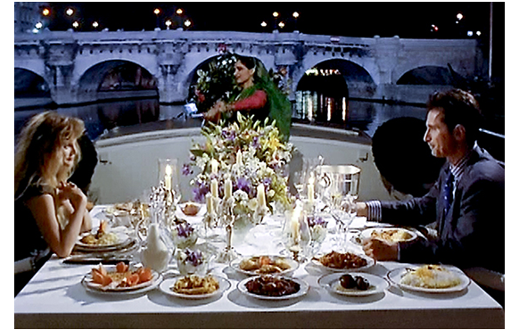 リシャールは、社長にロシア人から受け取った現金を見せている(1枚目の写真)。「現金で80万ドル? 汚い金に決まっとる!〔マネーロンダリングのこと〕。リシャールは、嘘を付いて弁解する。「ステフも信用しました」。その場にステファンがいないので不審に思って訊くと、「いませんが、署名は ここに」と、捏造したサインを見せる。リシャールのことなど てんで信用していない社長も、ステファンが了承したのならと、それ以上は詮索しない。一方、ステファンはシャルロットとの仲を再構築しようと、エセ宗教の集会にいた彼女を無理矢理引っ張り出し、チャーター船上でのディナーに誘う。このシーンも映画ならではのトリックが使われている。最初は、ノートル=ダム大聖堂の背面が映り、船はシテ島の最上流端からさらに上流へと向かう。しかし、次のカットでは、船は正面に見えるポン=ヌフへと進む(2枚目の写真)。右岸に船が見え、左岸に建物が見えるので、下流側から近付いていることが分かる。ところが、ポン=ヌフはシテ島の最下流端に架かる橋。島から上流に向かって離れていく船が、瞬間移動して、下流から島に接近していく船になっている。パリの住民なら奇妙に思うハズだ。因みにポン=ヌフは1606年に完成したパリで一番古い橋。しかし、ポン=ヌフ(Pont-Neuf)の“Neuf” は「新しい」という意味。この橋が出来た当時は、パリでは最新の橋だったので付けれた名がそのまま残っている。南フランスの大都市トゥールーズでも、現存最古の橋はポン=ヌフ(1632年)だ。逆の場合もある。ポン・ヴュー(Pont Vieux)〔“Vieux”〕は「古い」という意味〕が最古の橋の場合もある。最も有名なのは南フランスの古都アルビにあるポン・ヴュー(13世紀中葉)だ。脱線したが、船上の2人の会話の一端。「世界が、まるで違うのよ。あの子は可愛いけど、文明は2千年は遅れてる。東洋は沈黙、西洋は雄弁。あの山猿君は 西洋人だから騒がしい。村で お仲間と一緒の方が幸せじゃない? 『庭のカップ』や『コーヒーのイス』さんと」〔最初は『コーヒーカップ』 と『庭のイス』だった〕。彼女は、ミミを追い出したくて仕方がない。「シャルロット、2人の話をしよう。じき、離婚の書類も揃うし、もっと楽しまなきゃ。ミミ・シクは、リシャールの家だ。心配ない」。そのリシャールの家では、ミミがセーヌ川で魚をすくい獲っている(3枚目の写真、矢印の先はバケツ)。食べてしまった高価な熱帯魚の替わりだ。場面は少し前後するが、酔っ払って帰ってきたリシャールが、様変わりした水槽を見て(4枚目の写真)、「餌の やり過ぎじゃないか? ダイエットだぞ」と言うシーンは笑わせる。泳いでいる魚の大半は、背びれの形と鱗の光沢からAblette(コイ科の淡水魚)であろう。