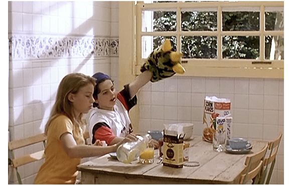 家に帰る途中の道路脇で、火を焚いて魚を焼くミミ。父は焼いた魚を食べつつ話しかける。「彼女には、もう会えん。両親が許さない。悲しむなよ。村に戻れば、幾らでもいるんだろ?」(1枚目の写真)。それに対し、ミミの返事は、以前「ボクは見えるよ」と言っていた時とはまるで違っていた。「ボクが好きな子は 一人だけ。彼女しか見えない。ぜんぜん」(2枚目の写真)。「残念だが、彼女は忘れろ」。「パリクー出てった時、忘れた?」。「最初は、頭から離れなかった。でも、次第に薄れ、ある朝目覚めると新しい人生があり、彼女は地平線のかなたに小さくなった。輝いてはいたけど、それは思い出でしかなかった」。「ボクの頭の中、彼女だけ」。その時、シャルロットから電話がかかってくる。「私、もう2時間も待ってるのよ! やっぱり、私よりあの子が大事なのね? もう、あなたの家には戻らないわ」。それを漏れ聞いたミミは、「忘れたら?」と言う。これが、ステファンの心がシャルロットから離れる第一歩となる。翌朝、リシャール家のキッチンでは、弟が「ソフィーは寄宿舎!」と叫んでからかっている(3枚目の写真)。ソフィーが強制的に母の実家のあるボージュ地方〔パリの東南東250キロの田舎〕の全寮制女子校に行かされそうになることが、この後の展開を変える大きなきっかけとなる。