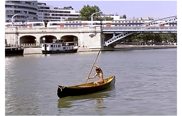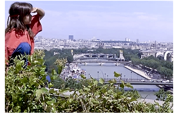 リシャールの家は、映画では、ステファンのアパルトマンより下流のセーヌ河畔とだけしか分からない。ノベライズではヌイイ地区(Neilly-sur-Seine)と書かれている。アパルトマンの位置も間違っていたので、正しいかどうか不明だが、ヌイイ地区は凱旋門と副都心ラ・デファンスとの間に位置する。セーヌ川はブーローニュの森を回りこんで180度向きを変えて、このシャン=ゼリゼの延長線上の大通りと交差するが、ちょうどその両側がヌイイ地区だ。ただ、映画の設定では、リシャールの家は河岸に面しているので、それに該当する場所はグランド・ジャット(Grande Jatte)島しかない。ステファンのアパルトマンからは、川沿いに15-16キロある〔陸路だと6キロ以下。如何にセーヌ川が蛇行しているか分かる〕。こんなに拘るのは、後で、ミミがカヌーでこの区間を漕ぐからだ。下流に向かって漕ぐので時速8キロとして2時間ほどで行けてしまう。しかし、実際には、午前中から漕ぎ始めて到着するのは暗くなってからなので、もっと遠くまで行ったハズだ。それなら納得できる。リシャールが余程金持ちでない限り、ヌイイのようなパリ屈指の高級住宅街に一軒家を持てるとは思えないからだ〔そんなに金持ちなら、1000万円ほどの損失で、家を抵当になど入れない〕。さて、リシャールの家に連れて来られたミミ。奥さんが2人の子供に「2人とも挨拶して」と言う(1枚目の写真)。挨拶を交わしたまでは良かったが、2人が見ていたTVのキャスターが「お早う、皆さん」と言うと、ミミはそっちにも「お早う」と話しかける。それを見た弟は、「テレビに しゃべってる」と笑う。奥さん:「ミミの国には テレビがないの」。「わ、ダサ~」(2枚目の写真)。姉の表情も面白い(3枚目の写真)。2人の母は「大丈夫、きっとうまくいくわ」と言うのだが…