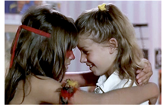リポ・リポで。ミミが、母の前で、たどたどしく本を読んでいる。ラ・フォンテーヌの『寓話』だ。その時、携帯電話が鳴る。これはミミが帰り際に父からもらったものだ〔ミミがもらった箱の中には、電話機しか入っていなかった。これは奇妙な話だ。アメリカのリメイク版では、ちゃんと太陽光による充電パネルも入っている。そうでなければ、電気のないリポ・リポで携帯電話は使えない〕。ミミが電話に出ると、父が、「ミミ! やったぞ! 吹き矢でハエを射止めた」と話す(1枚目の写真)。「ウソ、ダメ!」。「信じない? 見せに行こうか?」。「いつ? あとで?」。「いや、今すぐ」。その時、子供たちの「バブーン、バブーン」という声が聞こえる。ミミが小屋から飛び出ると、岸辺には父の姿があった。駈けていったミミは、父に飛びつき、勢い余って体が宙に舞う(2枚目の写真)。父は、吹き矢を取り出し、「どうだ?」と渡す。それを見たミミは、「インディオだ!」と請合う(3枚目の写真)。「リポ・リポに住む?」。「しばらく一緒にいる。狩り、教えろよ」。
