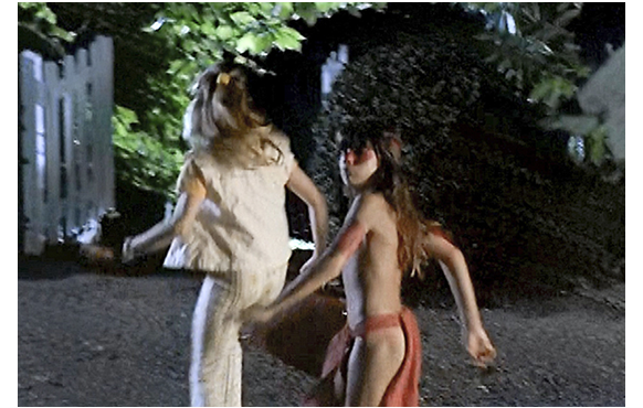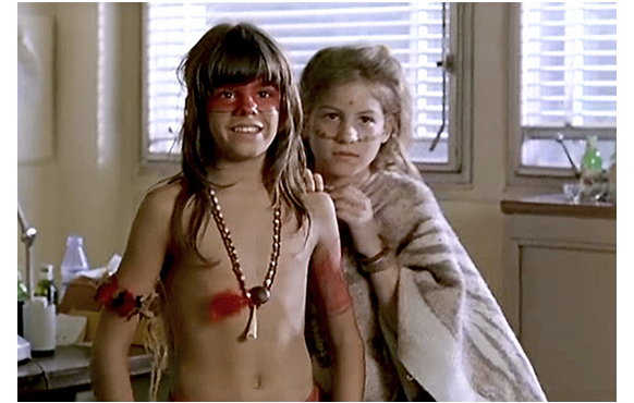 リシャールの家では、奥さんが、「今日は、お魚よ。お魚好き? ミミ・シク」と話かけている。ミミは、調理前の冷凍の魚をかじり、「ひどい魚。食べない」と言ってキッチンを出て行く。姉は、自分の部屋で彼氏に電話している(1枚目の写真)。「パパの上司の子供が来てるけど、すっごい変なの。庭で寝たりなんかして。遊園地に、一緒に行かされる」。そこに、「ソフィー、ジョナタン、お昼ですよ」の声。母が、先に来た弟に、「ミミを呼んできて、お庭よ」と言う。戻って来た弟は、「ママ、ミミが悪いコトしてる!」。それを聞いた母が庭に出て行くと、ミミは芝生の上で火を起こし、串刺しにした魚を食べている。「何 食べてるの?」。「これ、魚。おいしい」。「どこにあったの?」。「家の中」。その時、弟が飛んできて、「ママ、それパパの熱帯魚!」と叫ぶ。母は、「大変! きっと、心臓麻痺よ!」と動転。弟が姉に、「野蛮人が、パパの熱帯魚 食べた!」と叫ぶと、姉は、「やるじゃない。せいせいした!」。母は、「ミミ、悪い子ね。子供たちのパパが悲しむわ。あの人、熱帯魚クラブにも入って 可愛がってたのに」と叱るように言うが、ミミは、「心配ない。魚、川にいる」と言い、魚を食べながら、「食べる?」と尋ねる(2枚目の写真)。