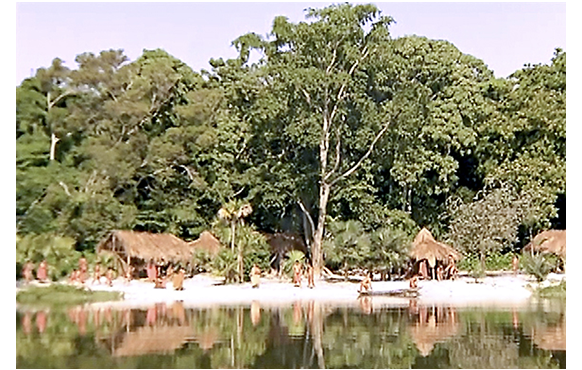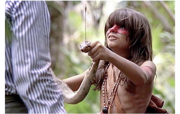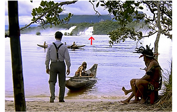 翌朝、ハンモックで寝ていたステファンは妻に起こされる。「ミミ・シクが、森を見せるって。待ってるわよ」。「ゆうべ、女の子とイチャついてたぞ」。「だから、お鍋がないんだわ」。「鍋が どうかした?」。「ここじゃ、お鍋は愛のしるし。あの子、もてるのよ」。ミミが岸辺にカヌーを持って来て、父を待っている(1枚目の写真、矢印は、映画の最初のシーンに映っていた滝)。2人は仲良くカヌーを漕いでいく。岸辺に猿がいると、ミミは「バブーン」といい、川に手を突っ込んで「トゥーナ」、鳥のいる空を指して「オーコ」と言う。ステファンは、その度にフランス語で返事をしていたが、最後の、「オーコ、鳥」と腕を振って鳥の真似をした時、ミミは、「違う、オーコはオーコ、鳥はポンポコ」とフランス語で訂正する。それを聞き、ステファンは「待った。話せるのか?」と訊く。「パリクー話してくれた、『狐とカラス』。カラスだまして チーズを取ったキツネの話」。いよいよジャングルに入って行った2人。父が蛇を見つけて怖がると、ミミが吹き矢で頭を射抜く。そして、ぐったりした蛇を持ち上げると、「ブルドゥ、あげる」と差し出す(2枚目の写真)。「怖い?」と訊かれ、仕方なく受け取るが、「これ、毒はないのか?」と訊くと、「あるよ。ブルドゥ 猛毒。体 腫れて、鼻血 ブー」という返事。「これ 死んでるのか? ピクっとしたぞ」。ミミは、「ううん、寝てるだけ」と言うと、蛇をつかみ取り、首を噛み砕くと、「今、死んだ」。ミミは、河原で火を起こし、蛇を焼いて父にも食べさせる。その時、砂地に足指で図形を描き、「あんたの国、これない? 村長さんの首飾り、付いてる形」と尋ねる。「あるとも、エッフェル塔だ。とっても大きいぞ」。「エッフェル塔… ボク 行ける?」(3枚目の写真)。「ああ、いいよ、そのうちな」。「大人になったら、行ける?」。「分かった。大人になったらな」〔「大人」の定義が、フランスとリポ・リポでは違う〕。ミミが「ワカテペ」と手を上げ、父はその手をパチンと叩いて「ワカテペ」と言う〔リポ・リポでは厳正な約束が交わされたことになるが、父に その認識はない〕。