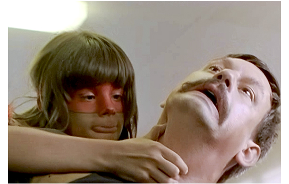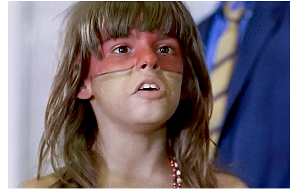 ミミとソフィーは警察に保護された。迎えにいったステファンに、刑事は、会わせる前に、「親の怠慢で、しょっぴいてもいいんだ。いい年の子を、裸でウロつかして」と苦情を並べる。控室で、2人を迎えるミミとソフィー(1枚目の写真)。「一緒に帰ろう」。ソフィーを振り返るミミ。リシャールも、「パパは怒ってないよ」と言う。それを聞いた刑事は、「おいおい、甘すぎるだろ! もっと、きつく言ってくれなきゃ!」と文句。ミミは、父に寄って行くと、「バブーン、帰りたい、リポ・リポ、ボクの村」と言う。刑事が、「帰せ、帰せ。そこが居場所だ。変わりモンが一人減る」と憎まれ口を叩く。ミミ:「うるさい!」〔前、父に教わった〕(2枚目の写真)。「黙らせんと、タダじゃ済まさんぞ」。今度は、父が「うるさい!」。「親が親だから、こんな問題児が…」とつかみかかろうとした刑事の喉に、ミミの親指が食い込む(3枚目の写真)。初めて見た「技」に驚く2人。ミミは、「押した」と言って、喉を押す格好をする。そこに別の刑事が入って来て、「相棒に何した!?」と詰問。父は、「私の息子が… 親指でインディオ流に…」と言いつつ、刑事の首に親指を当てる。何も起きない。「ぶち込んで欲しいか?」。「これ、全然 効かないけど、なぜなんだ?」。ミミは、「親指ダメなら、こうする」と言って、刑事の股間を蹴る(4枚目の写真、赤い矢印は父の効果のない親指押し、黄色の矢印は股間蹴り)。「行くよ、バブーン」。シーンとしては面白いが、身元はバレているので、後どうなったのだろうか?