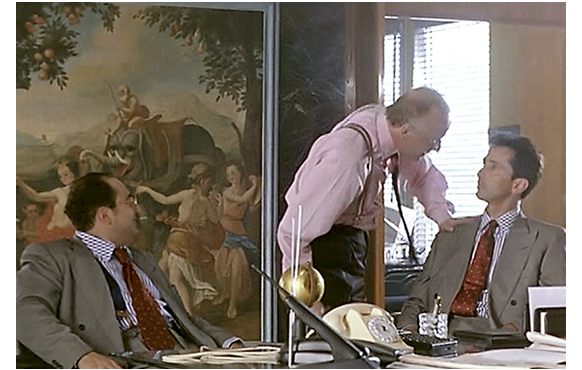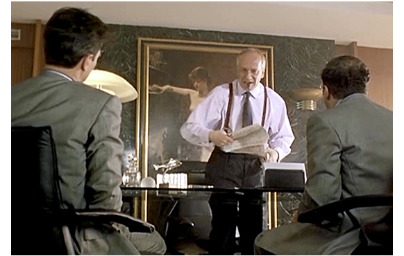 場面は、会社に切り替わり、ミミも同行。秘書の部屋で待たされている。社長室からは、「確認を 忘れるからだ!」という叱咤の声。ミミは、秘書が気に入ったので、「これ あげる」と鍋を渡そうとする(1枚目の写真)。「気持ちは嬉しいけど、お鍋はウチに沢山あるの」。「そんな たくさん?」。「そうよ、いろんなのがね。大きいのもあるし、中くらいのや小さいのも」。ミミがニヤニヤしながら「男好きだね」と言う。社長室からは、「無能だったと謝れば済む、と思っとるのか?」との怒鳴り声。秘書はライターでタバコに火を点けようとし、ミミはそれを物珍しげに見ながら、「火?」と訊く。「そんなに 珍しい? じゃあ、あげる」(2枚目の写真)。社長:「今日の相場で、損失はまた膨らんだ!」。その大声に、ペットのタランチュラが反応し、容器から出て社長室に入って行く。「今日は140ドルでも、明日になれば120ドルだ!」。そして、新聞を投げ捨てる(3枚目の写真)。新聞を拾おうと屈んだステファンは蜘蛛に気付く。ステファンは蜘蛛を何とかしようと必死になる。会話は社長とリシャールの間で続く。「分かってるじゃないか! 自分たちが、崖っぷちにいると!」。「破局です」。「責任感があるなら、どうすべきか分かってるな?! 損害は自弁しろ! 尻拭いはしてやらん! そうなりたくなかったら、必死に売って来い!」。蜘蛛がどんどん社長に近付くのを見たステファンは、自分で奇声を上げて秘書室に蜘蛛を呼び寄せ、ミミに回収させる。