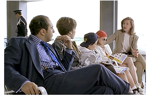 再び空港。今度は、ストックホルムに赴くステファンとその秘書、リシャールの一家4人が一緒だ。ラウンジでは、秘書が一家に、「ストックホルムは いい所で…」と説明している(1枚目の写真)。しかし、肝心のステファンの姿はどこにもない。彼がいたのはトイレ。そこに1匹のハエが。ステファンは吹き矢をセットすると、思い切り ひと吹き。針のような棒は、見事にハエを貫いた。彼は、それを手に持って意気揚々とリシャールの元に向かう。ラウンジでは、ストックホルム行きの最終搭乗案内が流れている。リシャールは、「ステフめ! 搭乗券持って どこ行った! 最低最悪だ!」。彼には、上司という認識ができていない。そこに、ステファン登場。「リシャール、やったぞ!」と刺さったハエを見せる(2枚目の写真、矢印はハエ)。