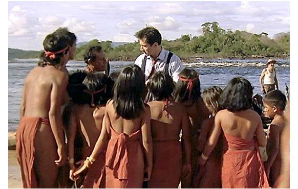 一方、パリからベネズエラに飛ぶ飛行機の中では、ステファンが大声で電話をかけている。はた迷惑なことなど意に介さない人間であることがひと目で分かる。使っている携帯は、映画の制作が1993年だとしても旧式で、1980年代の末の製品のように見える。バリバリのビジネスマンの割にはお粗末。会話の相手は格下の同僚のリシャールで、香港市場で4500トンを80万ドルで買い付けた大豆をいつ売るかを、パソコンで東京市場の相場のグラフを見ながら、「まだ、高値を更新してる。もう少し粘れ。指示するまで待ってろ」と話している〔80万ドルで買ったという文言は映画のどこにも出てこないが、後で、ロシア人が買い取る時の価格が80万ドルなので、その金額に合わせた〕。最後に言った言葉が、「離婚手続きが終わり次第、帰国する」。ステファンがベネズエラに向かっているのは、今付き合っているシャルロットと結婚するには、13年前 突然出奔した妻と離婚する必要があり、その妻が仏領ギニアに住んでいるため。ステファンが飛行機を降りると、そこにはベネズエラの弁護士が待っていた。早く帰国したいステファンは、「時間が切迫してまして。判事さんとは、何時に?」と訊く。返事は、「実は、奥さんに ちょい問題が」。「え? 応じないんですか?」。「いやぁ、そうじゃない。離婚申請を、奥さん まだ知らんのだよ。何べん言うても、誰も、郵便局に書類を取りに来ん」(1枚目の写真)。ステファンは、「7000キロも 旅して来たのに? 来月、結婚するんだぞ!」と怒るが、「私、奇跡 起こせないね」といなされる。そして、「カナバヨ行って、奥さん連れてきて、サインさせる。書類できたら、領事館とコネあるから、うまくやるね」。ステファンが、「カナバヨって、どこ?」と訊き、弁護士が指差した地図には、堂々と「AMAZONAS」の文字が〔アマゾナス州はブラジルのベネズエラと接する州。カナバヨは架空の知名だが、仏領ギニアにあるという設定なので、あまりにも ずさん〕。ステファンは、小型機をチャーターして弁護士とそこに向かうことに。カナバヨはひどい雨。地面は未舗装で水溜りだらけ。「心配は要りませんて。雨は止みます」と言うが、土砂降りは続く。村にあった掘っ建て小屋のような郵便局に行き、13年前の写真を見せる。弁護士の通訳で、何週間も手紙を取りに来ていないことが分かる。「どこに住んでるか、訊いて」。返事はリポ・リポ。映画は仏領ギニアで撮影する予定が、雨季のため、ベネズエラで撮影されたが、リポ・リポという村は本当に仏領ギニアにある(北緯3度18分、西経54度3分)。カナバヨからモーターの付いた木のボートでリポ・リポに向かう(弁護士は、「役立たず!」と置き去り)。舟に乗ること3時間でようやくリポ・リポの集落が見えてくる(3枚目の写真)。ステファンは、「いいか? 訊いてくるからな。5分待て!」と言って、舟から降りるのだが…