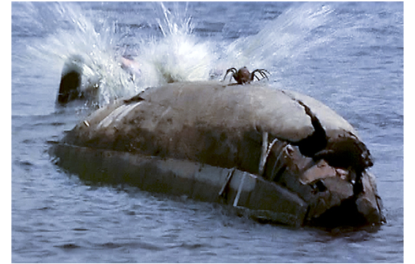 その後、ミミは昼寝に入る。すると、1匹のタランチュラが、砂の上に寝ているミミの上に這い上がる。父は、「ミミ、ミミ、動くな!! 危険だ!! 超でかい蜘蛛だ!!」と叫ぶ。すると、蜘蛛はその声に反応するかのうように、結構なスピードで父の方に歩いてくる。「何だよ、おい!! 何で来るんだ!!」と叫べば叫ぶほど寄って来る。ミミは声で目が覚めるが、それが自分のペットの蜘蛛だと分かっているので、父が慌てて逃げまどっているのを笑って見ている。父は、最後に 舟底を見せて漂着している壊れたカヌーの上に逃げる。その先は川しかないのに、蜘蛛は舟底の上にまで上がってくる。父に残された道は川に落ちるだけ(1枚目の写真)。ミミは、起き上がって舟まで来ると、「これ、マイティカ」といって、タランチュラを手にのせ、「わめくと、マイティカ、襲いかかる。いつもは、いい子。もっと悪い子 いる。ククイエ」と言う(2枚目の写真)。「ククイエって?」。ミミが指さすと、それは父に向かって真っ直ぐ泳いでくる大型のアメリカワニだった。父は、「ここは、地獄だ!」と逃げ出す(3枚目の写真、矢印はワニ)。