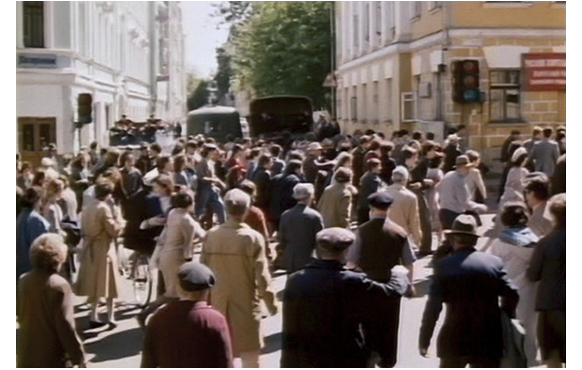 街の中心に行くと、そこは、市民で埋め尽くされていた。交差点の角にあるパン屋の前で、店主が「同志たち、なぜ去らない? パンはない。立ち去りなさい」「朝のパンは、売り切れた。午後は入荷しない」と叫んでいる。しかし、ある男がショーウインドーのガラスを石で割ると拍手が起こり、飾ってあった肖像画を外して、「ニキータ・フルシチョフ! パンを寄こせ!」と言うと、「ユダヤ人と 共産党員をやっつけろ!」という掛け声も起きる。「奴は、白パンを、むさぼり食ってやがる!」。不穏な雰囲気だ。そこに街路を塞ぐようにバックしながら現われた軍の車両。逃げ惑う群集。ヴァディクはガールフレンドと逃げるが、捕まってしまう。