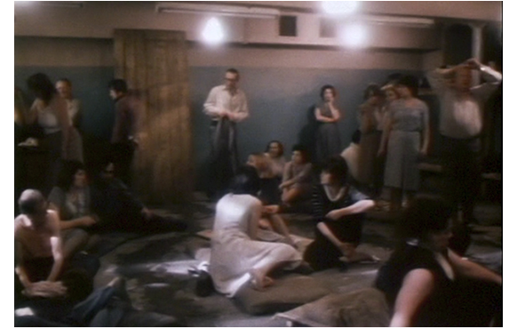 全員が連れて来られたのは大部屋。全員を中に入れ施錠、説明は何もない。こうしたことに慣れた男が、長い木の板を2枚壁に立てかけ、「ここが、トイレだ」と指示する。さっそく利用する女性たち。部屋の壁に板を立てかけただけなので、汚物も臭いも部屋に残る。しかも中は暑い。どうなるか不安に思う人、自分は党員なのにと憤慨する人。夜の10時に突然ドアが開き、布団が十数枚投げ込まれる。そして、朝、またドアが開き、大きな缶が1つだけ入れられる。中味は牛乳だった。これだけが朝食。しかし、コップ1つない。先に手回し良くトイレを作った男が、今度も采配する。テーブルに缶を置き、傾けた缶から流れる牛乳を飲ませるのだ。列を作る人々。その缶が貯まって5つになった頃、人々の半分は上半身裸、精神状態や健康状態にも異変が。そして、衰弱死が出るに及び、トイレ男が3度目に一か八かの行動に出る。ボールペンを片手にドアをバンバン叩き、覗き穴が開いた瞬間、そこにボープペンを突き刺したのだ。警防を持った軍人が雪崩れ込み、片っ端から殴りつける。ただ、それを機会に全員監房へと移された。