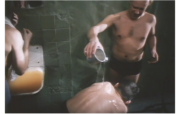 散髪とシャワーの有名なシーン。全裸になり服を抱きしめて散髪されるヴァディク。坊主刈りだ。その後、シャワーを浴びる。意地悪されて、冷水に飛び上がる。監獄の1コマだと思えば何の問題もないシーンだ。彼にとって良かったことは、最後にシャワー係が長ズボンをくれたこと。たとえ死体から取った物でもヴァディクには嬉しいプレゼントだ