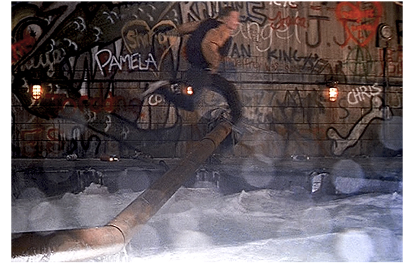 ライアンは、渦に落ちる少し前の時間に戻った。ちょうど、女の子が「あなたを からかってるだけよ」と呼びかけ、チャッキーが「こんなのバカげてる。トム・クルーズの真似か?」と止めた時だ。前と違って賢くなったライアンは(1枚目の写真)、「そうだよな(Why not?)」と言って、スプレー缶を渦の中に投げ捨てる。ブラッドが、「嘘だろ。何しやがる? お前は この先ずっとダメ男だぞ。この意気地なし野郎!」と煽っても無視する。その時、かつてライアンを渦に投げ込んだパイプから勢いよく水が噴き出し、細い鋼管が折れてしまう。今度は、戻れなくなったブラッドが「ここから出してくれ! 助けて!」と泣きつくことに(2枚目の写真)。